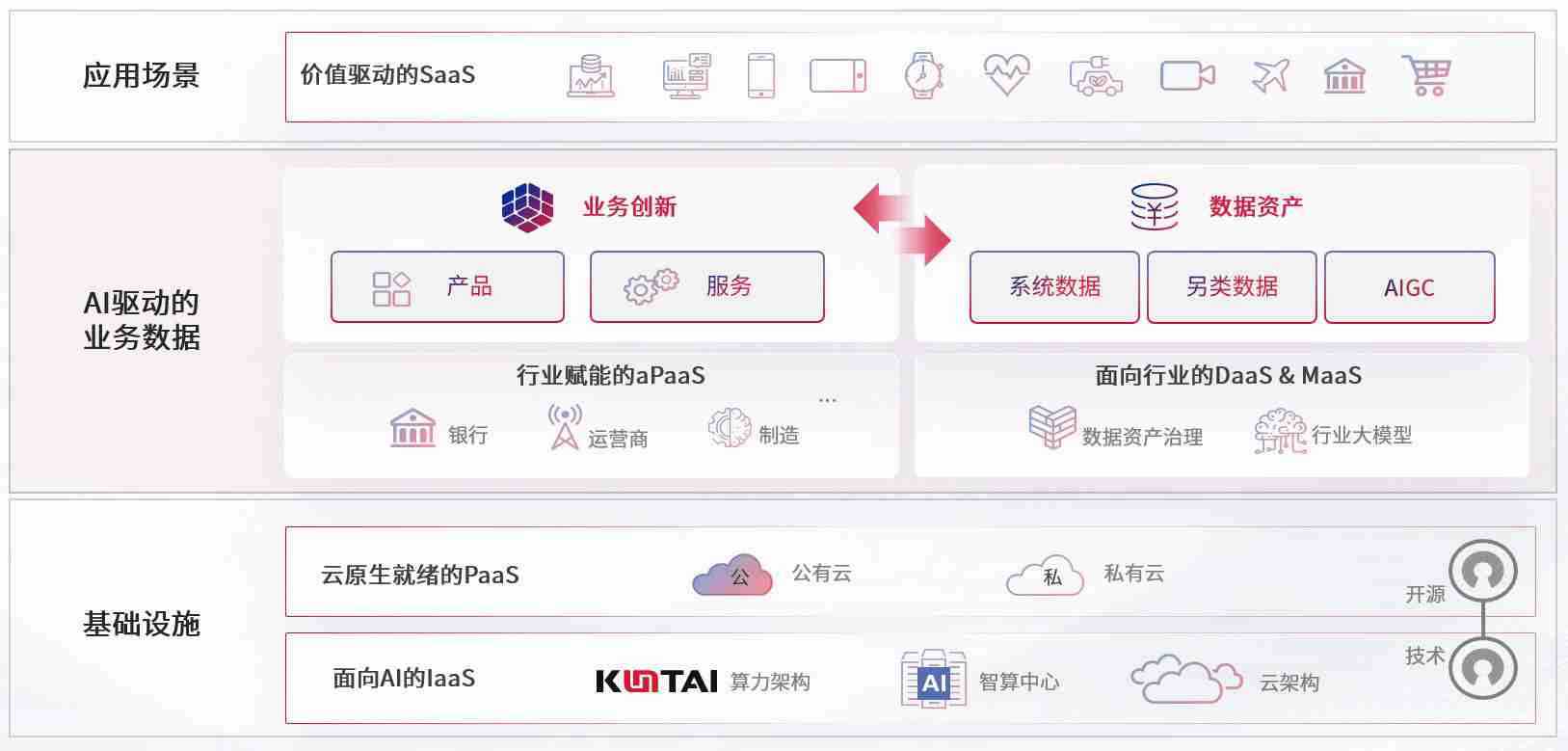 数字时代,,,,围绕企业数字化转型的关键要素,,NG娱乐数码开创性的提出数云融合战略和技术体系框架,,,,着力在云原生、、、、数字原生、、、、AI原生和信创产业上架构产品和服务能力,,为处在不同数字化转型阶段的快消零售、、、汽车、、、、金融、、、医疗、、、政企、、、、教育、、运营商等行业客户提供泛在的敏捷IT能力和融合的数据驱动能力,,构建跨界融合创新的数字业务场景和新业务模式,,,,助力企业级客户建立面向未来的核心能力和竞争优势,,,,全面推动社会的数字化、、、、智能化转型升级。。